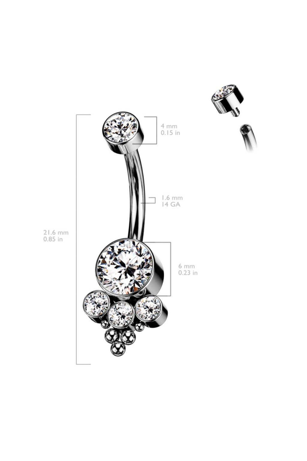 Titánový piercing do pupku s vnútorným závitom a klastrom Lucia